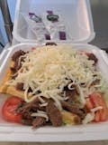 Cheddar Cheese Sauce, Steak, Mushrooms, Green Peppers, Red Onions & Pizza Cheese.